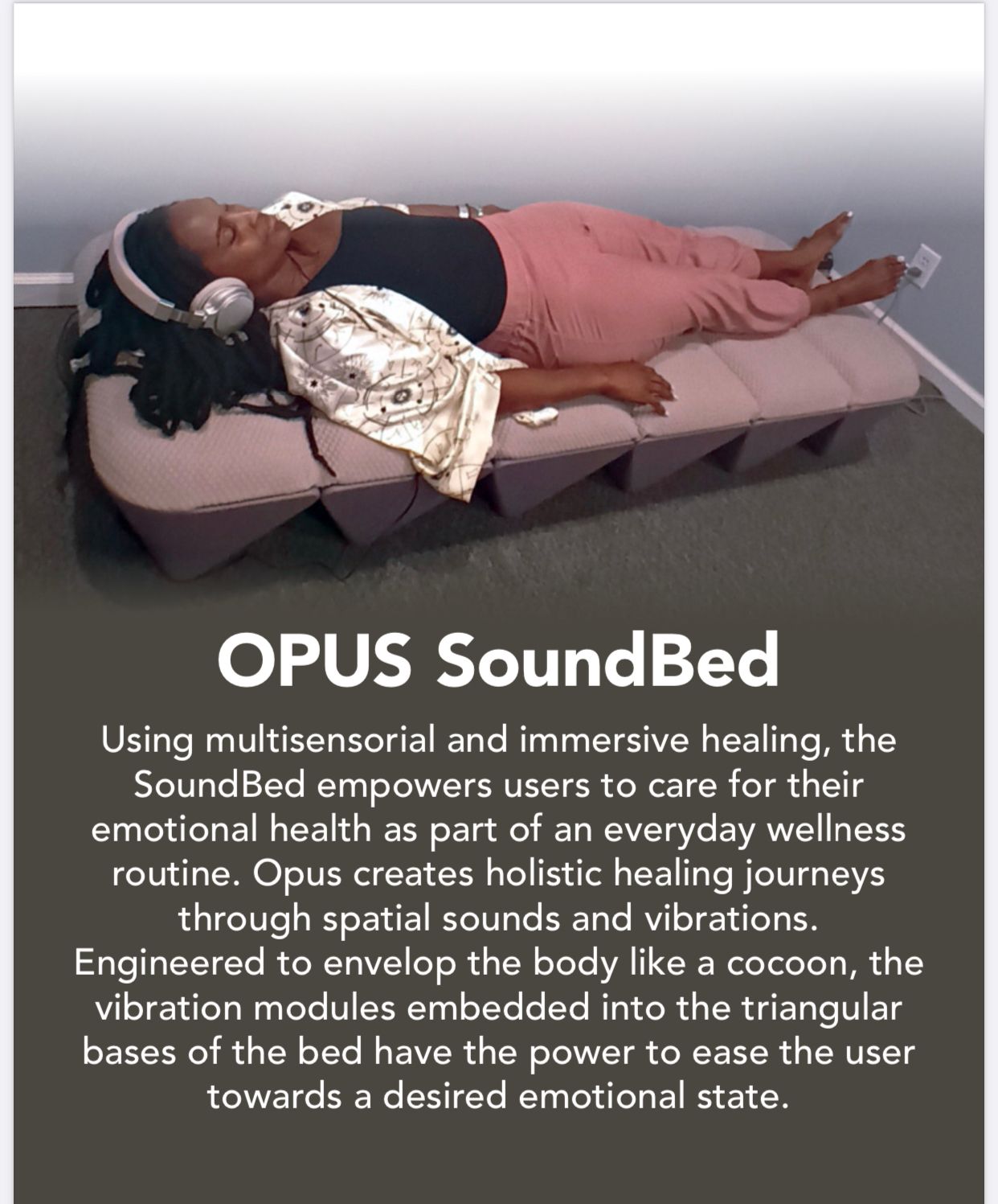 Using multisensorial and immersive healing, the Opus SoundBed empowers users to care for their emotional health as part of an everyday wellness routine. Opus creates holistic healing journeys through spatial sounds and vibrations-combined with proven healing techniques and practices-that are curated to shift your mental and emotional state in as little as 7 minutes. Engineered to envelop the body like a cocoon, the vibration modules embedded into the triangular bases of the bed have the power to ease the user towards a desired emotional state. The SoundBed is programmed to produce immersive, vibrating sensations that address the entire body from head to toe or be set to target specific areas. Sessions vary in length, programs are between 7 and 76 minutes long.
